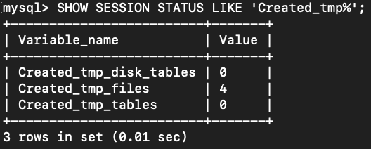 이 경우 SHOW SESSION STATUS LIKE 'Created_tmp%'; 를 확인해볼 수 있다.
