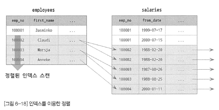 employees, salaries 조인 결과 → salary를 임시테이블에 저장 (salary 유니크 인덱스 생성)